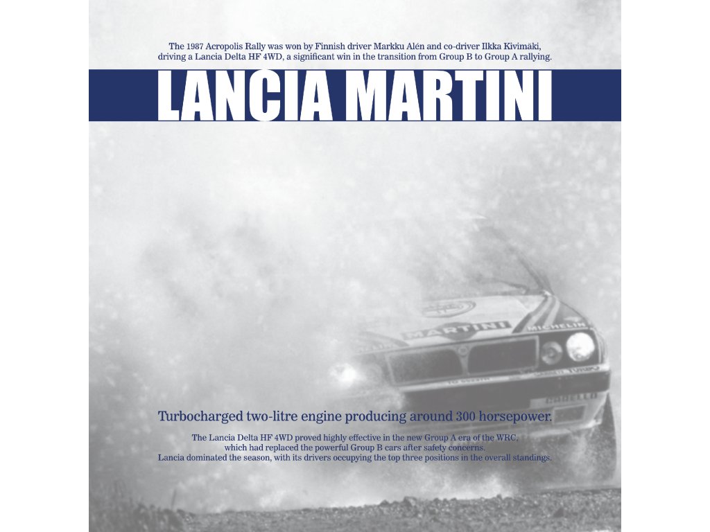 V Acropolis Rallye 1987 zvítězila posádka Markku Alén a Ilkka Kivimäki s vozem Lancia Delta HF 4WD. Další Lancia, řízená Juhou Kankkunenem, obsadila druhé místo, čímž tým Lancia dosáhl dvojitého vítězství.